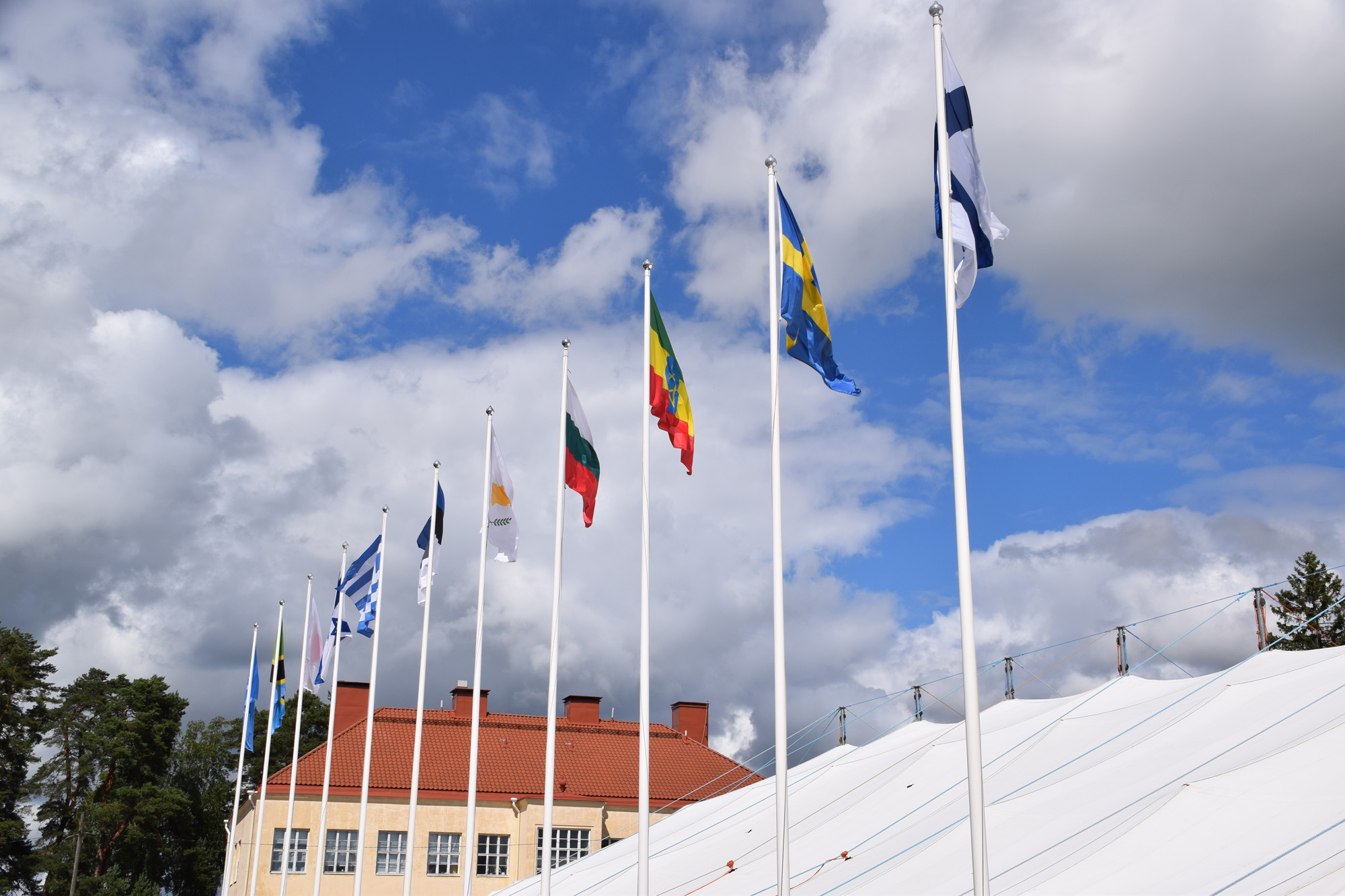 LIPPURIVISTÖ. Eri maiden liput viestivät Kansanlähetyksen työstä kotiovelta maailman ääriin. KUVA: MARJAANA PERTTULA