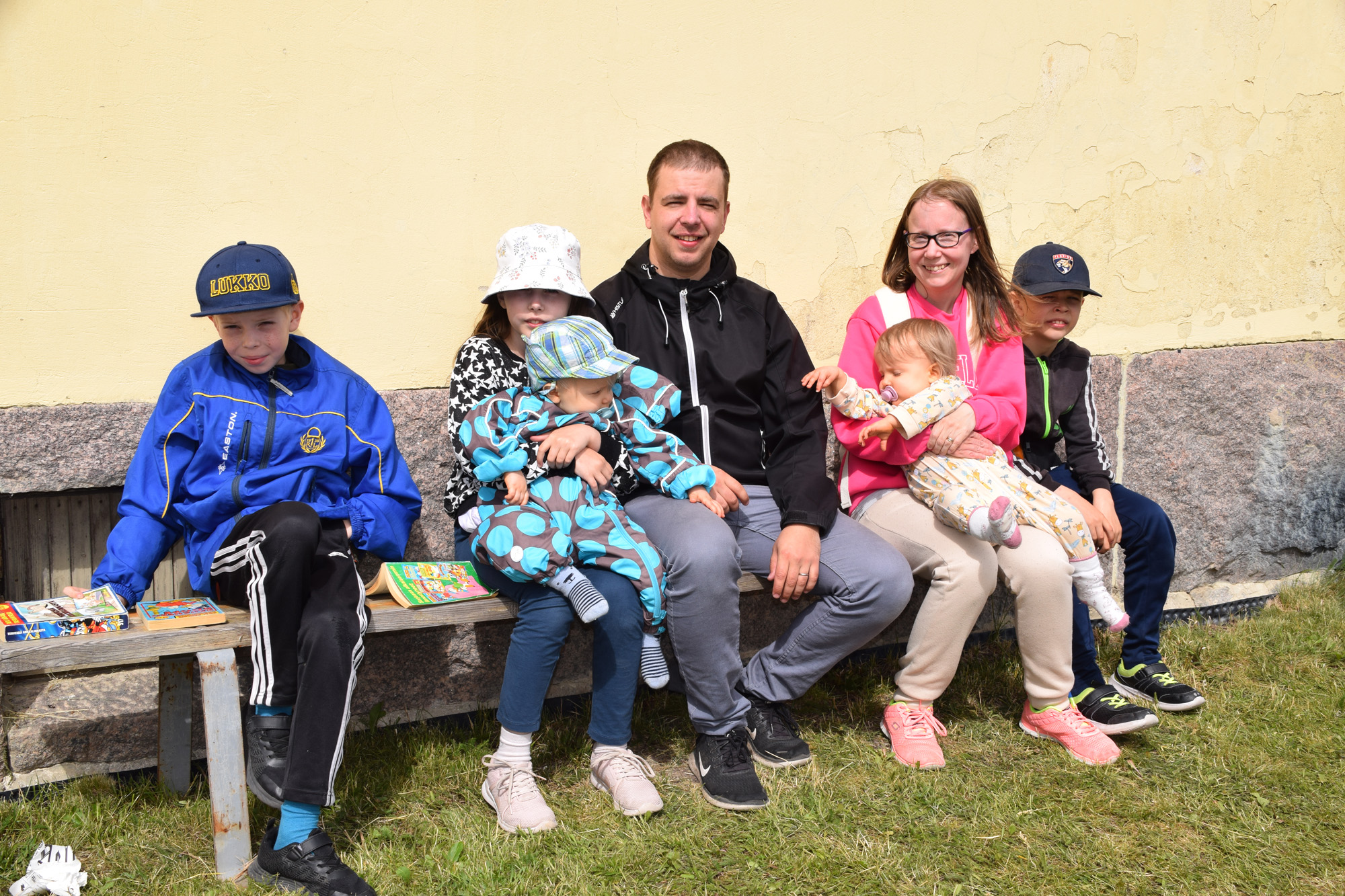 RAUMALT´. Niemisten perhe nautti kesästä Kansanlähetyspäivillä. Vasemmalta: Elia, Ester sylissään Johannes, Markus, Meeri sylissään Eveliina ja Jamiel. KUVA: MARJAANA PERTTULA