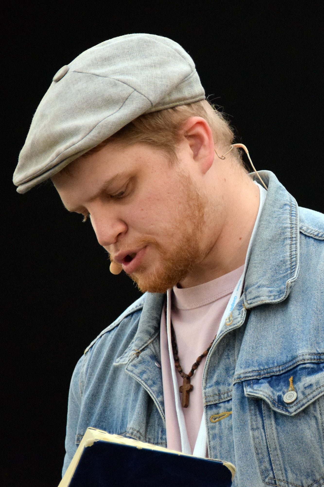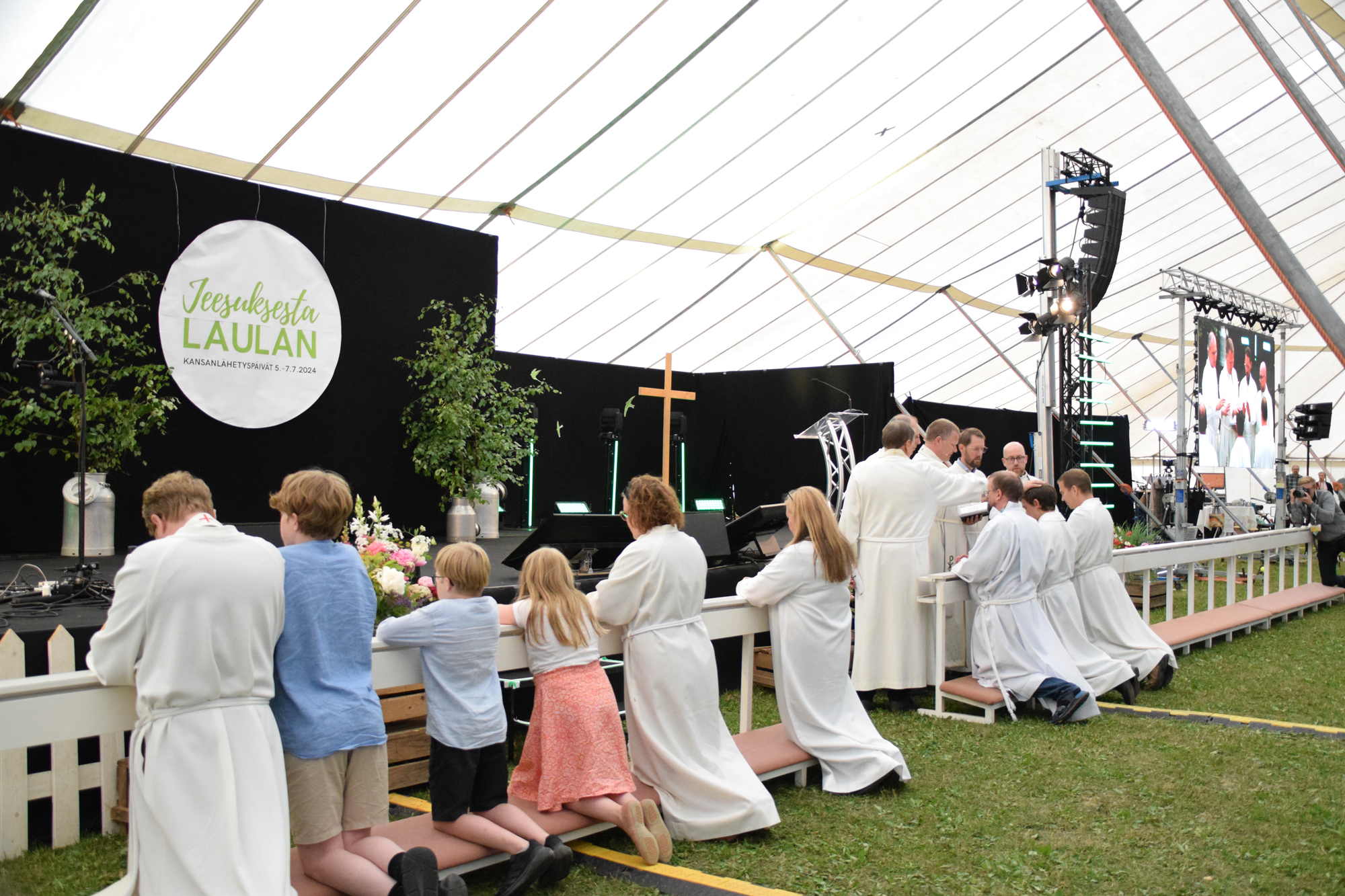 ”SALLIKAA LASTEN TULLA.” Kansanlähetyksen ulkomaantyönjohtaja Markus Alajoki siunasi lapsia Lähetysjuhlassa lauantaina. Taustalla juniorityön koordinaattori Aleksi Soininen ja Donkki-aasi. KUVA: MARJAANA PERTTULA