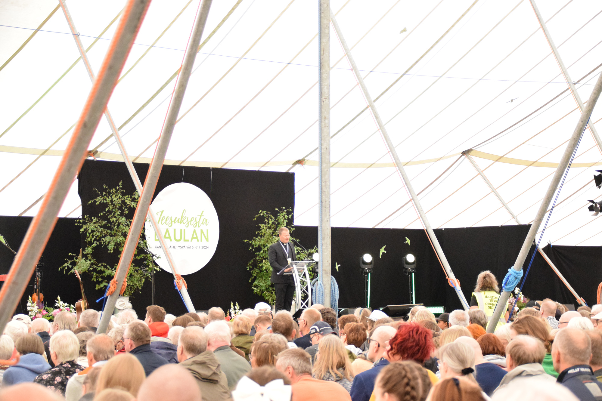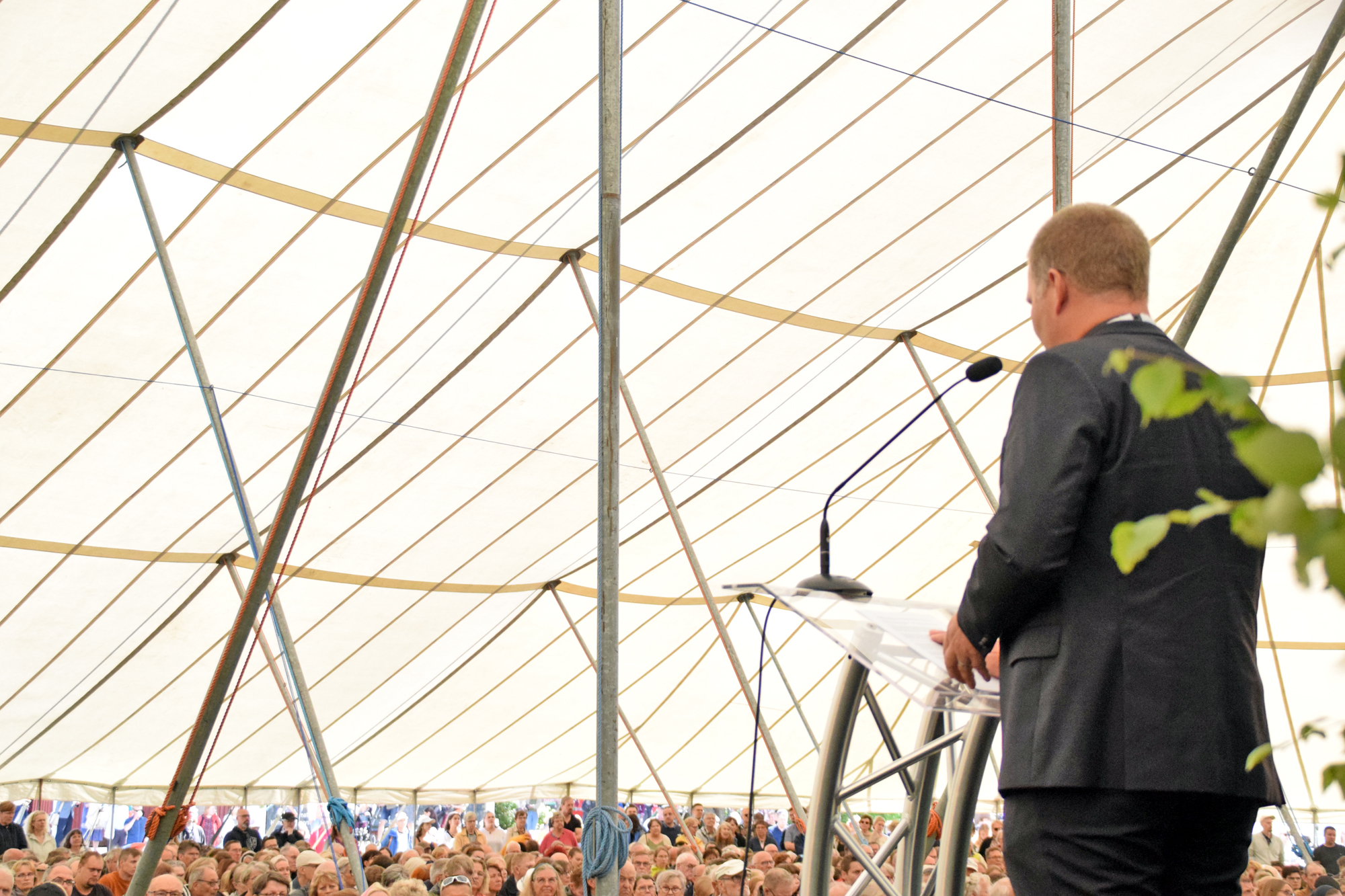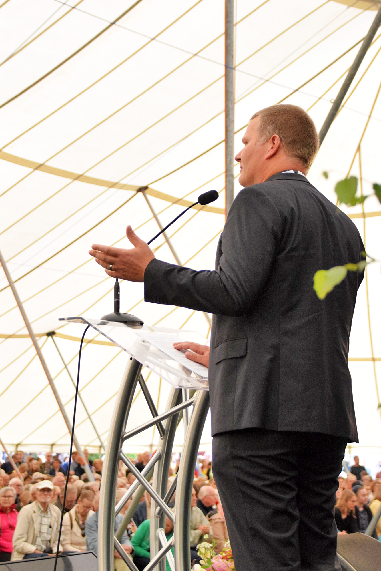 TELTTA TÄYNNÄ. Kansanlähetyksen lähetysjohtaja Daniel Nummela puhui juhlakansalle. KUVA: NAOMI MGAYA