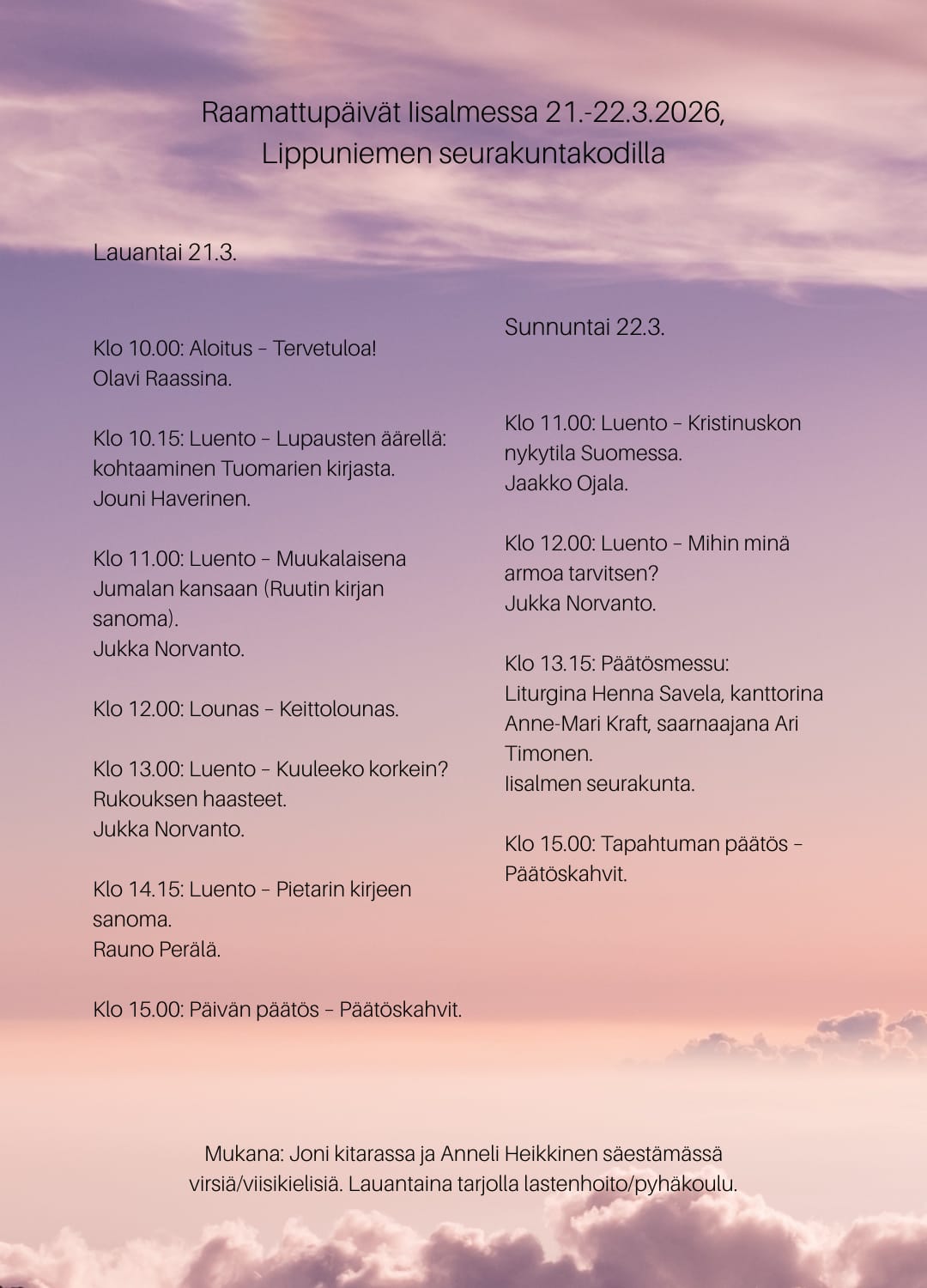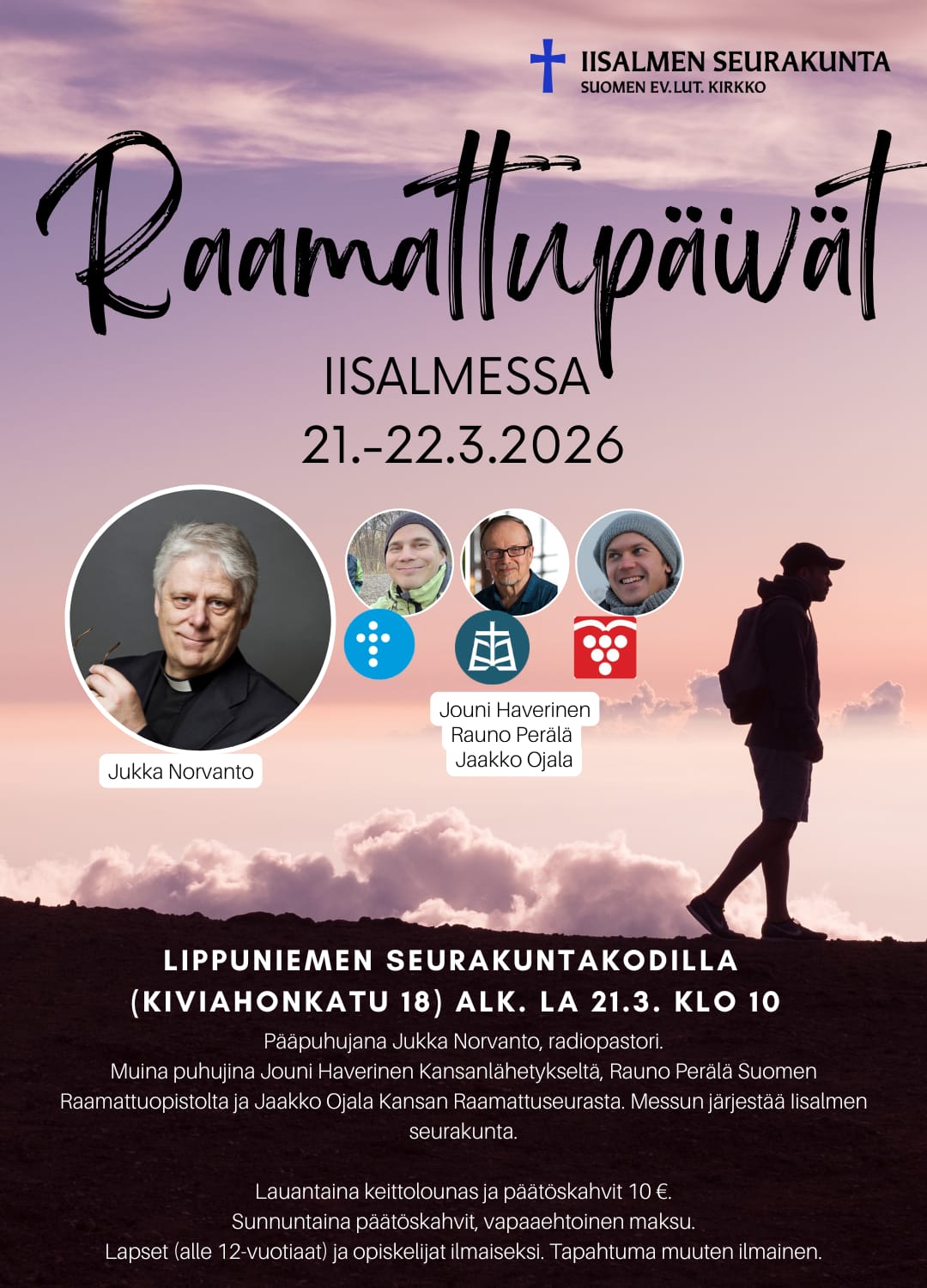 La 21.3 klo 10-16 Iisalmen raamattupäivät, Jukka Norvanto, KL, KRS, SRO, Lippuniemen srk-koti, Iisalmi