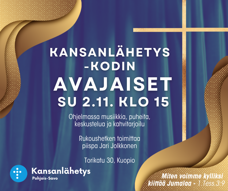 Su 2.11 klo 15:00 Uudistuneen Lähetyskodin avajaiset, Torikatu 30, Kuopio. Piispa Jari Jolkkonen