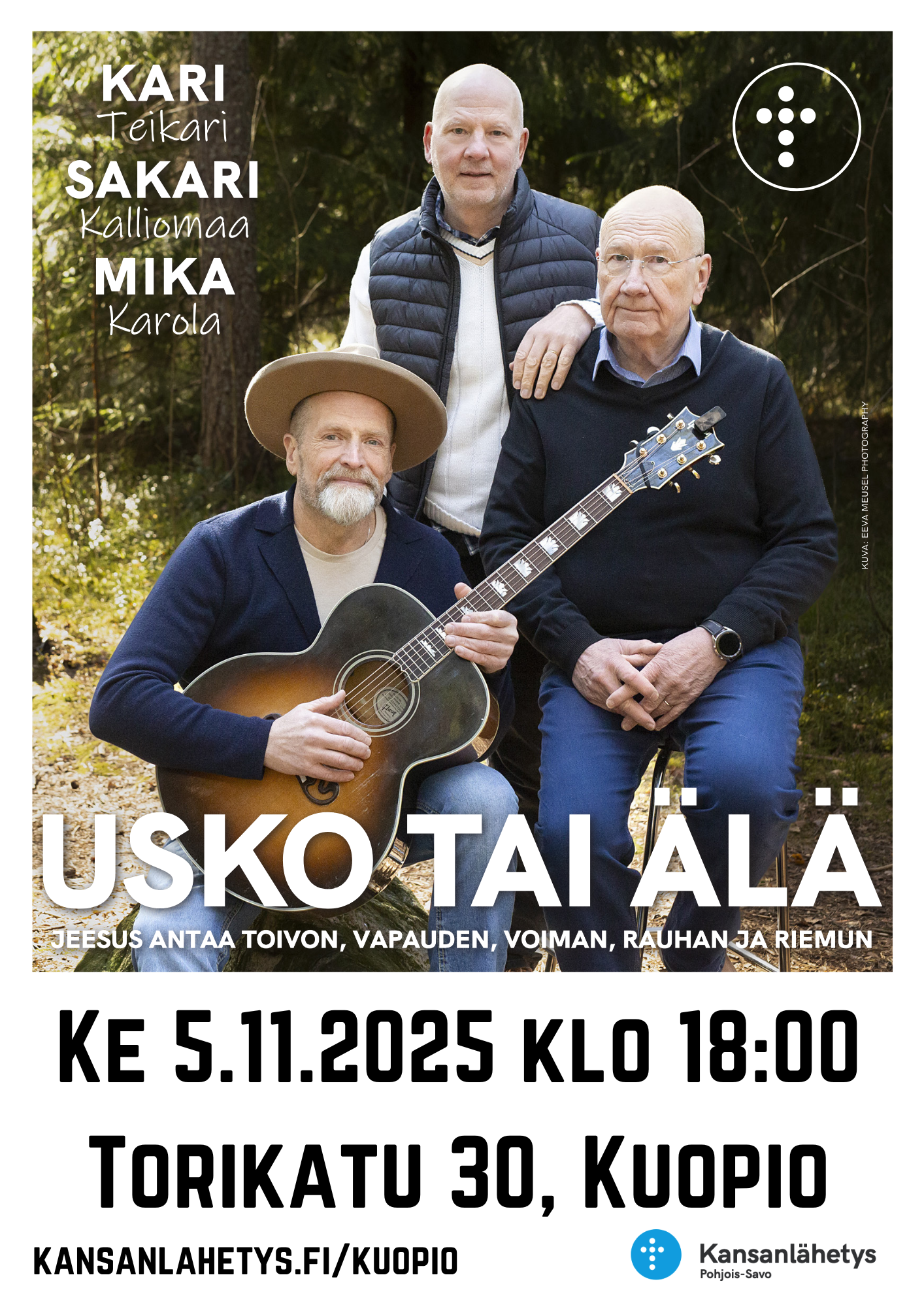 Ke 5.11 klo 18:00, Usko tai älä, Lähetyskoti. Ilonkorjuu: Sakari Kalliomaa, Kari Teikari, Mika Karola.