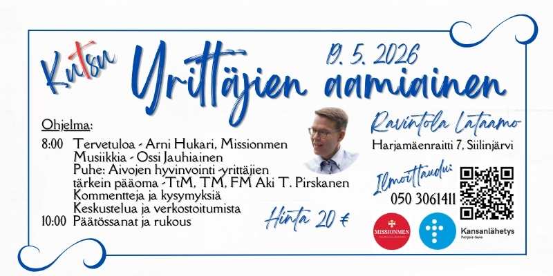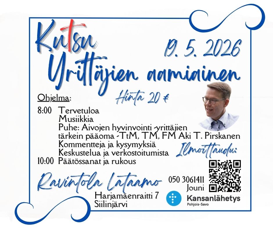 Ti 19.5 klo 8:00-10:00 Yrittäjien aamiainen, Aivojen hyvinvointi – yrittäjien tärkein pääoma, Ravintola Lataamo, Harjamäenraitti 7, Siilinjärvi