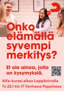 Alfa-kurssi on elämän merkityksen etsijöille. Alfa-kurssia on kuvattu joskus kristinuskon peruskurssiksi tai rippikoulun kertaukseksi, jos riparilla puhutut asiat ovat unohtuneet. Lisätietoa kursista: kokeilealfaa.fi