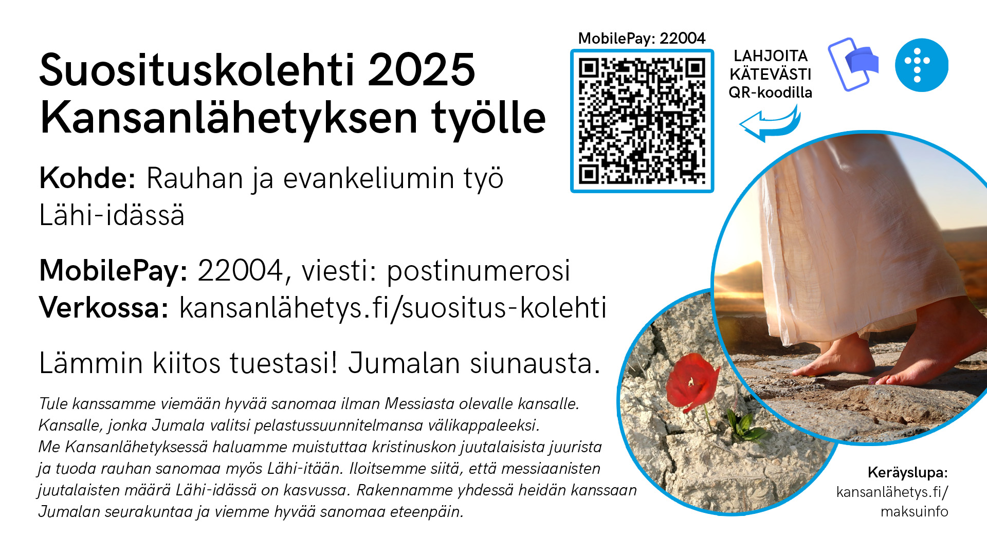 Tule kanssamme viemään hyvää sanomaa ilman Messiasta olevalle kansalle. Kansalle, jonka Jumala valitsi pelastussuunnitelmansa välikappaleeksi.